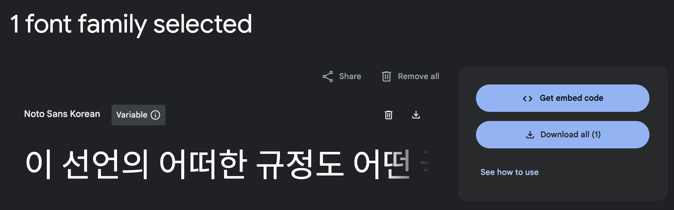 Get embed code 버튼을 클릭하면 웹, 플러터, 안드로이드, iOS에서 사용할 수 있는 코드를 복사할 수 있습니다. 웹에서 <link>와 @import 두 가지 방식 중에 요구 사항에 맞는 방법을 선택해 코드를 복사해 붙여넣으면 됩니다.