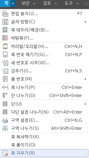 쪽 지우기는 쪽 탭에서 사용할 수 있습니다. 더보기 아이콘을 클릭하면 하단에 쪽 지우기를 선택하면 커서가 현재 놓여진 페이지가 삭제됩니다.